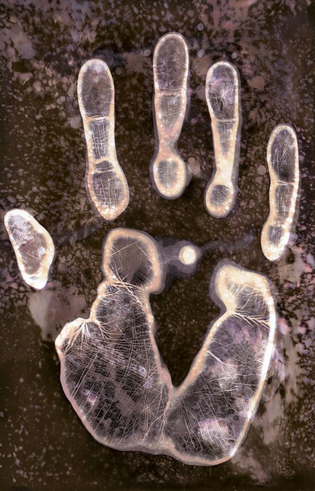 This was made by painting on light-sensitive paper with photographic chemicals. I use other products such as oil, toothpaste, lemon juice and glue. It's a hands-on analogue process that's unpredictable, glitchy, smelly and messy.