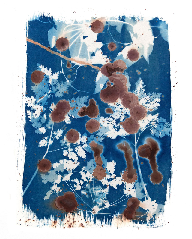 A giclee print from the original handmade cyanotype mixed with areas of Van Dyke Brown. Cyanotype and Vank Dyke Browns are made by coating paper with photographic chemistry from 1840s and then exposing to sunlight. This piece is made using cow parsley collected growing from the roadside.
